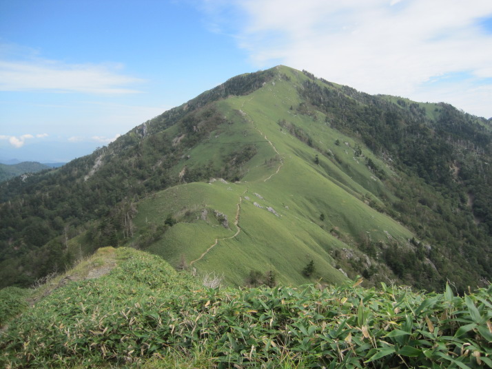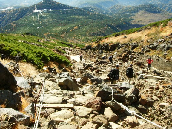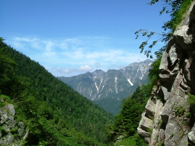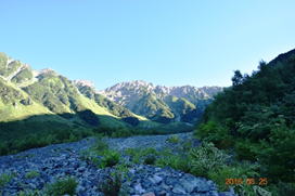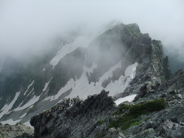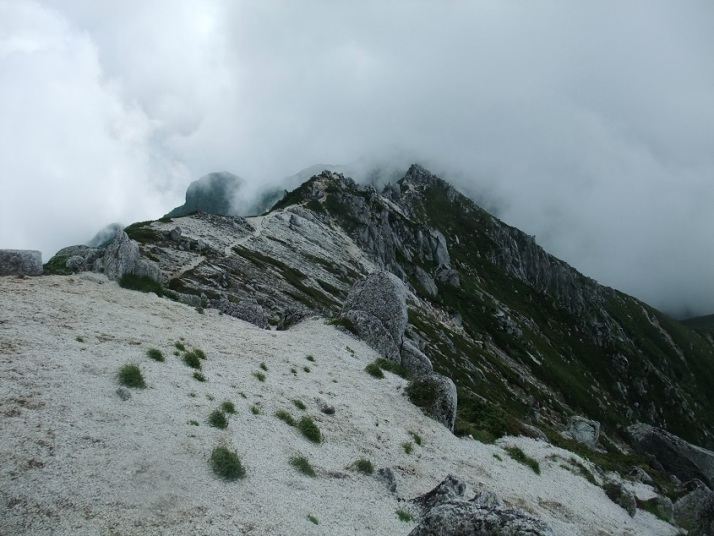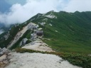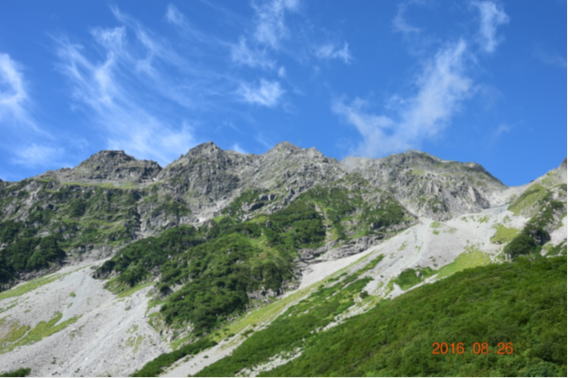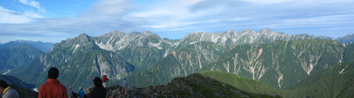 穂高岳山荘は右から1つ目の窪みにあります。ここから、上高地には約5時間歩いて