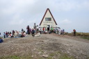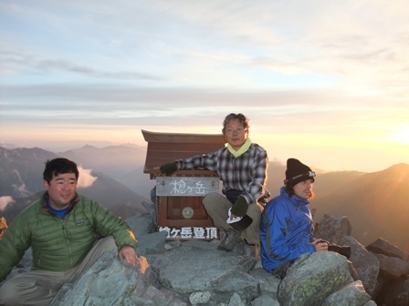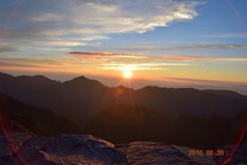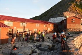 穂高山荘から見た日の出 穂高山荘の外、早朝のにぎわい 穂高岳山荘の裏(西)笠ヶ岳標高2,897 m