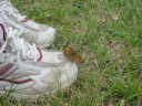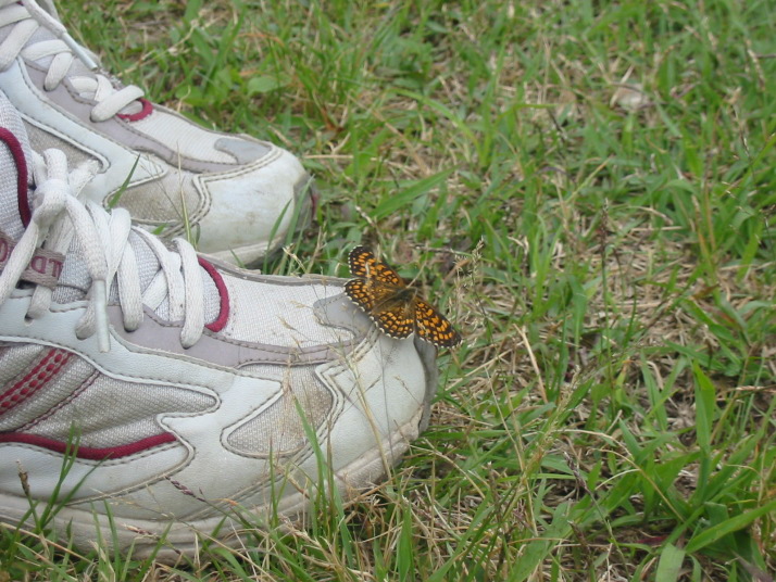 靴にとまったウスイロヒョウモンモドキ、人懐こい蝶でした。