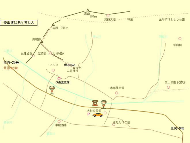 コースタイム( 登山道はありません、尾根づたいに登ります) 片道約2.4キロ、参考程度の時間です 大杉公民館→10分→大福寺→7分→大杉城跡→40分→高城跡→60分→一の段 10分← 10分← 20分← 40分← 戻る
