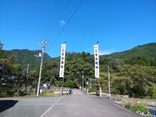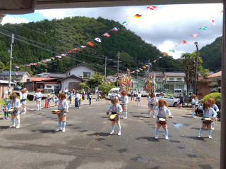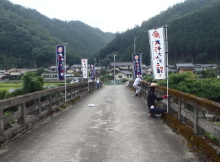 大杉橋・二宮神社の石段には、祭当番の5組が大幟を建てました。