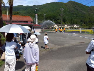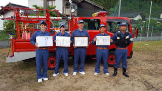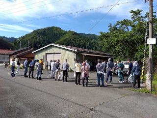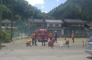 6月3日 大杉・山笠の消防団が操法の大屋方面隊の大会に出席のため準備をしています。