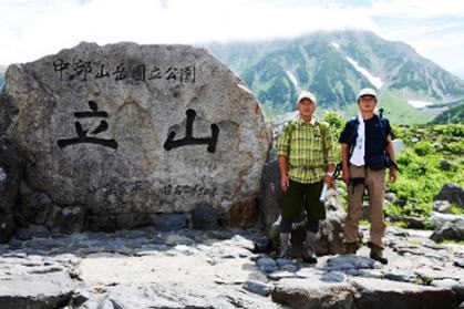 ・室堂で記念写真を撮り、ミクリガ池を越え少し歩くと雷鳥沢の多くのテントがあり、こ の後に登る背後の標高差500m近い雷鳥坂がくっきりと見えた。