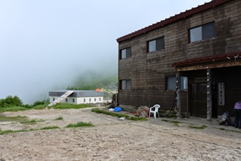 ・劔御前小舎に着くと、20〜30人近くの人達が休憩していたが多くの人達は立山縦走 コースの人達であった。ガスで景色は全く見えなかった。