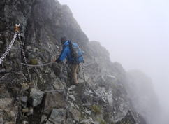 ・下り初めて間もなく、ステンレスの長い鎖が10本近く続く道になる。7年前、早月尾 根を登ったとき、こんなに鎖あったかなあと思いながら下った。