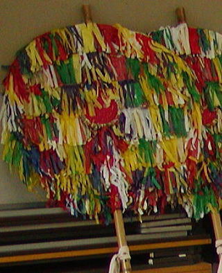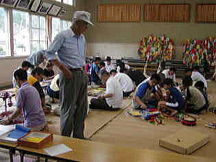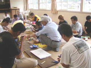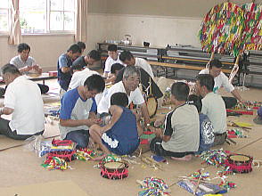 子供から老人まで太鼓に付ける五色の色紙を準備する